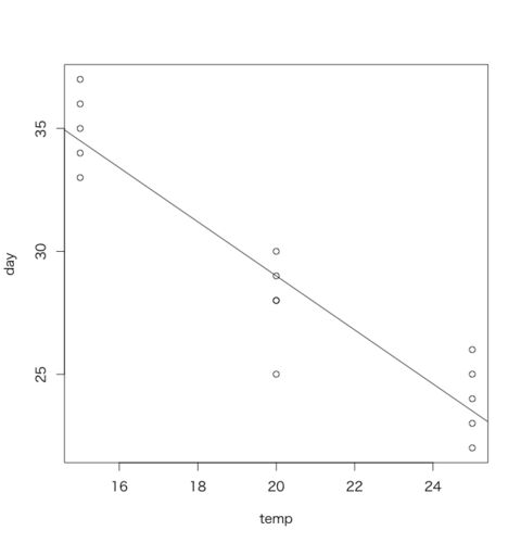 JMPには逆推定というコマンドがある 次のようなデータを用意して、線形回帰を行うとする。 temp <- rep(c(15, 20, 25), c(5, 5, 5)) day <- c(34, 33, 36, 37, 35, 30, 28, 29, 25, 28, 23, 25, 22, 24, 26) こんなかんじで適当に。 > result <- lm(day~temp…