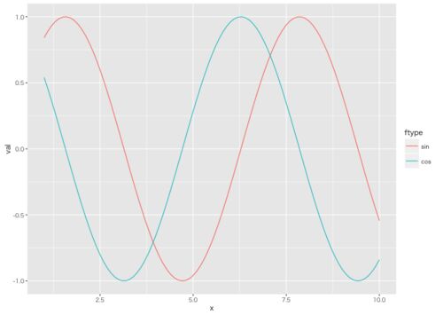 ラベルと項目名を操作する 以下の説明ではggplot2を含めて3つのパッケージを使う。 library(dplyr) library(tidyr) library(ggplot2) データは次のように準備した。 # テストデータの準備 testdata <- data.frame(x = seq(1, 10, 0.1)) %>% mutate(sin = sin…